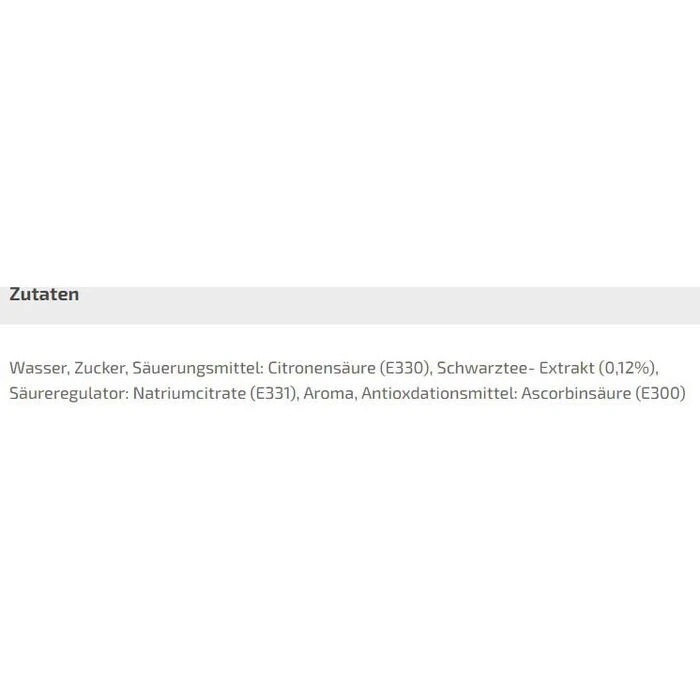 Zutaten: Wasser, Zucker, Säuerungsmittel: Citronensäure (E330), Schwarztee-Extrakt (0,12%), Säureregulator: Natriumcitrate (E331), Aroma, Antioxdationsmittel: Ascorbinsäure (E300)