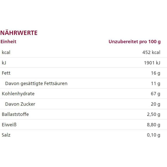 Zutaten: DINKELMEHL* 60%, BUTTER* 16%, Rohrohrzucker*, VOLLMILCH*, Honig*, GERSTENMALZEXTRAKT*, Backtriebmittel: Ammoniumhydrogencarbonat (Hirschhornsalz), Meersalz, Bourbonvanilleschote* gemahlen