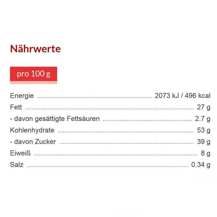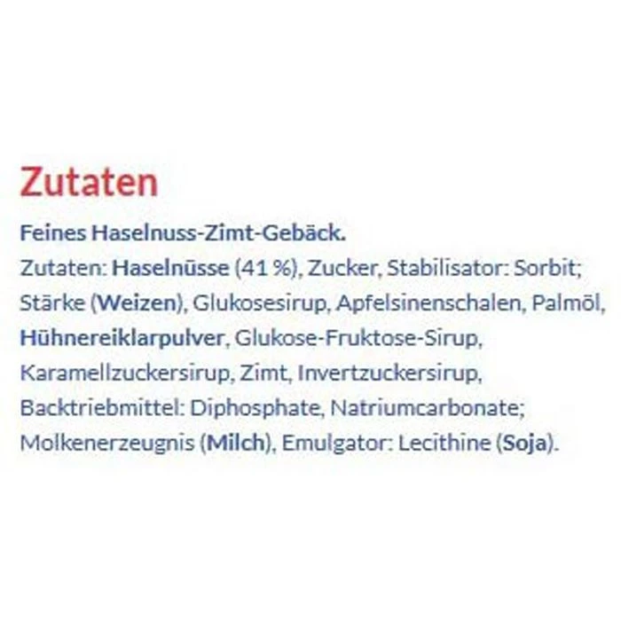 HASELNÜSSE (41 %), Zucker, Stabilisator: Sorbit; Stärke (WEIZEN), Glukosesirup, Apfelsinenschalen, Palmöl, HÜHNEREIKLARPULVER, Glukose-Fruktose-Sirup, Karamellzuckersirup, Zimt, Invertzuckersirup, Backtriebmittel: Diphosphate, Natriumcarbonate; MOLKENERZEUGNIS, Emulgator: Lecithine (SOJA)