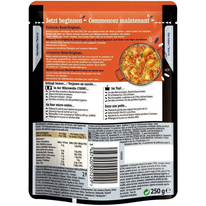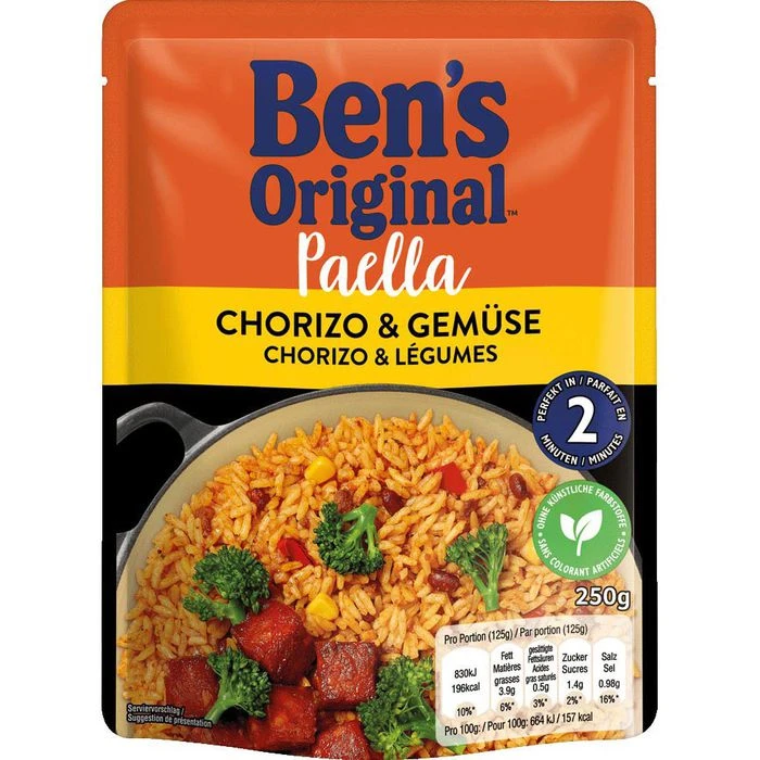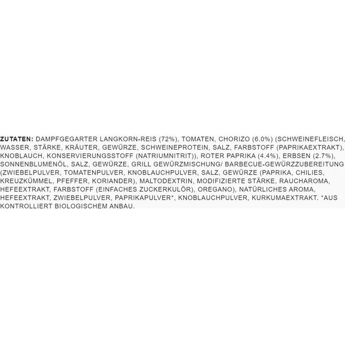 Zutaten: Dampfgegarter Langkorn-Reis (72%), Tomaten, Chorizo (6.0%) (Schweinefleisch, Wasser, Stärke, Kräuter, Gewürze, Schweineprotein, Salz, Farbstoff (Paprikaextrakt), Knoblauch, Konservierungsstoff (Natriumnitrit)), Roter Paprika (4.4%), Erbsen (2.7%), Sonnenblumenöl, Salz, Gewürze, Grill Gewürzmischung/ Barbecue-Gewürzzubereitung (Zwiebelpulver, Tomatenpulver, Knoblauchpulver, Salz, Gewürze (Paprika, Chilies, Kreuzkümmel, Pfeffer, Koriander), Maltodextrin, Modifizierte Stärke, Raucharoma, Hefeextrakt, Farbstoff (einfaches Zuckerkulör), Oregano), natürliches Aroma, Hefeextrakt, Zwiebelpulver, Paprikapulver*, Knoblauchpulver, Kurkumaextrakt. *aus kontrolliert biologischem Anbau.