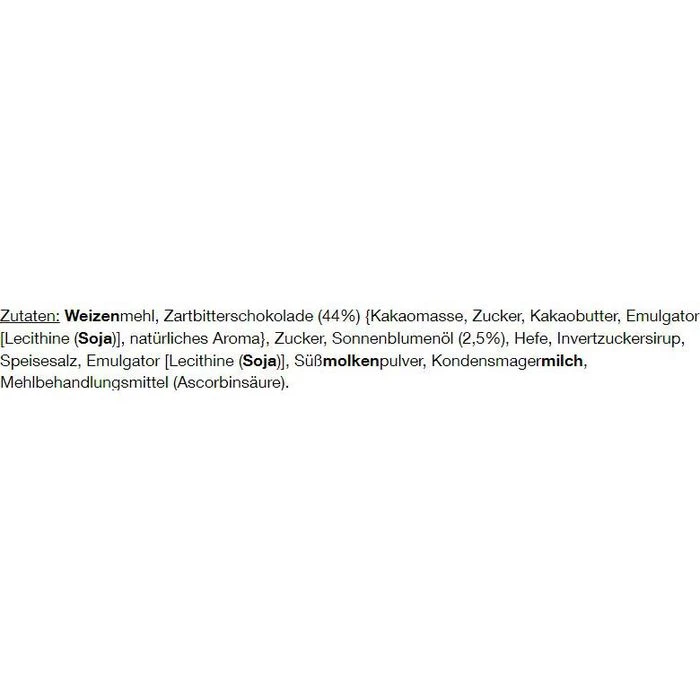 Zutaten: WEIZENMEHL, Zartbitterschokolade (44%) {Kakaomasse, Zucker, Kakaobutter, Emulgator [Lecithine (SOJA)], natürliches Aroma}, Zucker, Sonnenblumenöl (2,5%), Hefe, Invertzuckersirup, Speisesalz, Emulgator [Lecithine (SOJA)], SÜSSMOLKENPULVER, KONDENSMAGERMILCH, Mehlbehandlungsmittel (Ascorbinsäure).