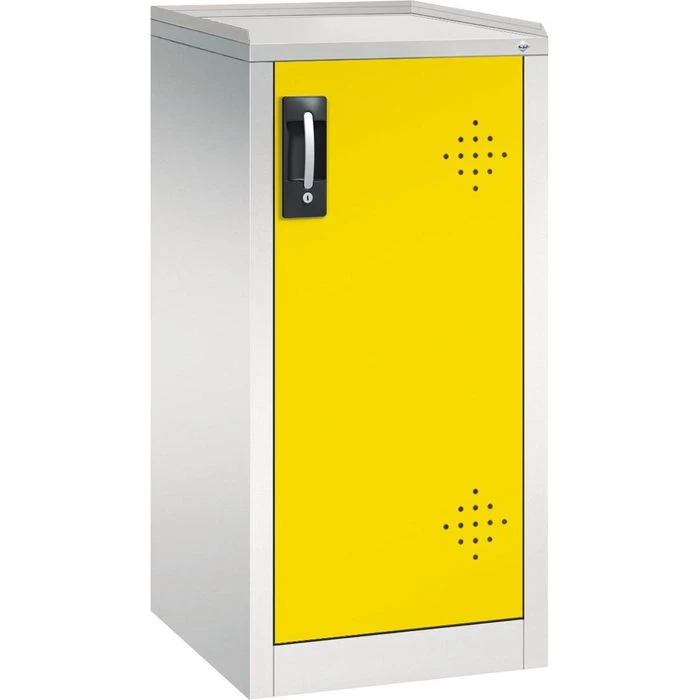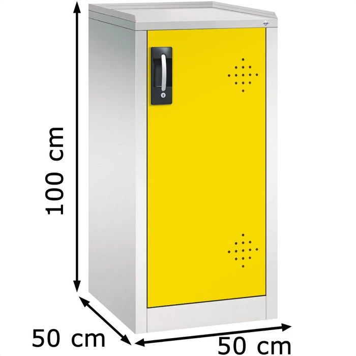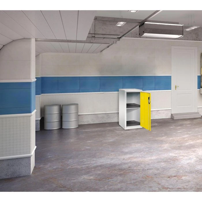 Der Umweltschrank besteht aus massivem Stahlblech mit Einbrennlackierung und abschließbaren Flügeltüren.