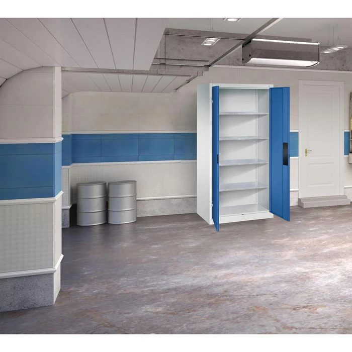 Der Werkzeugschrank besteht aus Stahlblech mit verzinkten Fachböden. Die abschließbaren Flügeltüren dienen der sicheren Aufbewahrung Ihrer Werkzeuge und Materialien.