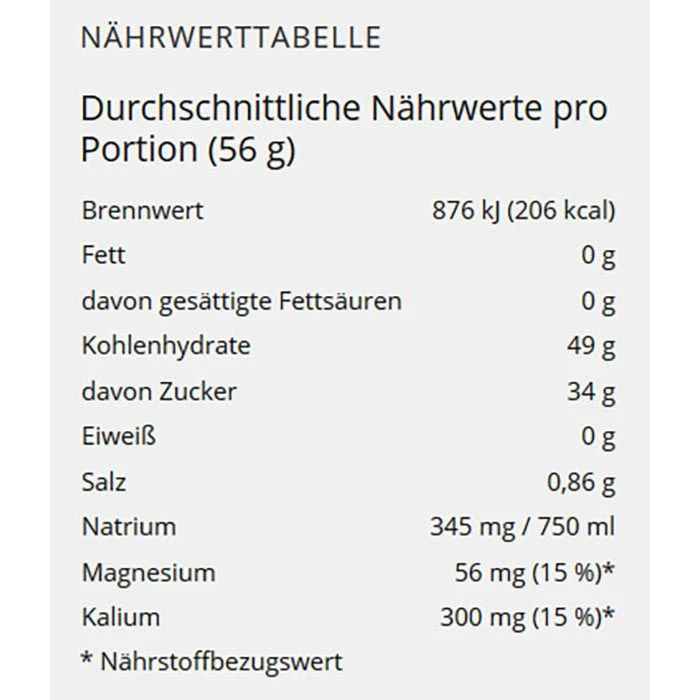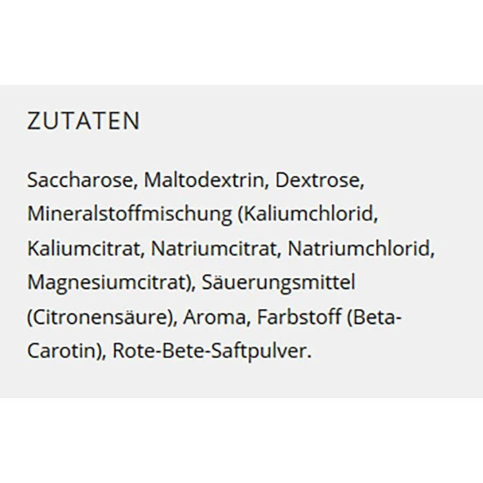 Zutaten: Saccharose, Maltodextrin, Dextrose, Mineralstoffmischung (Kaliumchlorid, Kaliumcitrat, Natriumcitrat, Natriumchlorid, Magnesiumcitrat), Säuerungsmittel (Citronensäure), Aroma, Farbstoff (Beta-Carotin), Rote-Bete-Saftpulver
