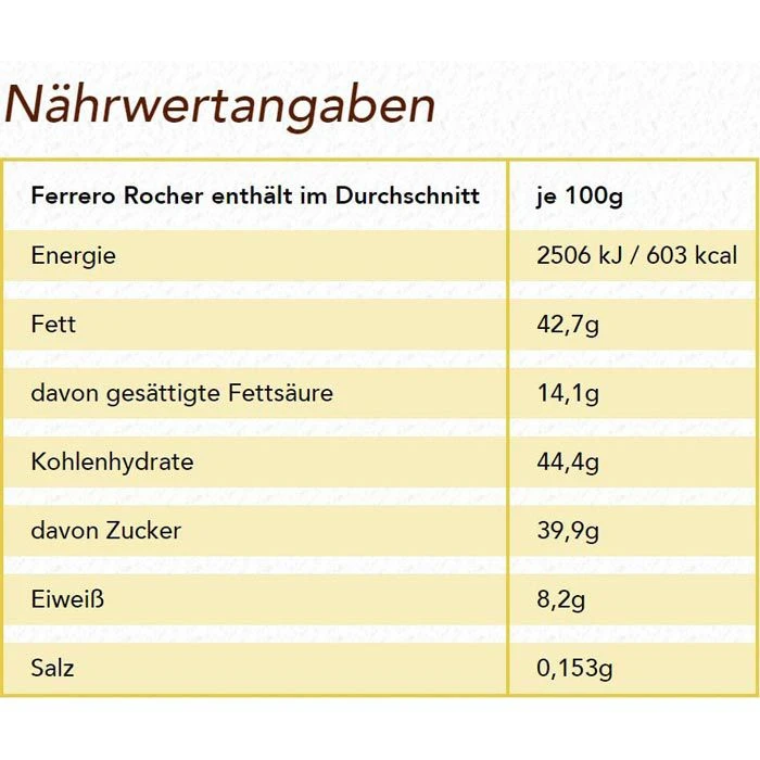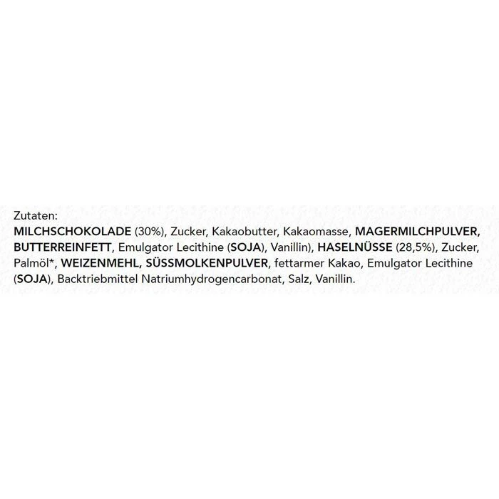 Zutaten: MILCHSCHOKOLADE 30% (Zucker, Kakaobutter, Kakaomasse, MAGERMILCHPULVER, BUTTERREINFETT, Emulgator Lecithine (SOJA), Vanillin), HASELNÜSSE (28,5%), Zucker, Palmöl, WEIZENMEHL, SÜSSMOLKENPULVER, fettarmer Kakao, Emulgator Lecithine (SOJA), Backtriebmittel Natriumhydrogencarbonat, Salz, Vanillin