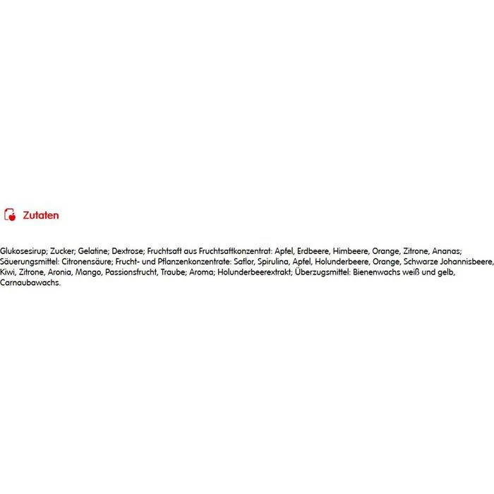 Glukosesirup, Zucker, Gelatine, Dextrose, Fruchtsaft aus Fruchtsaftkonzentrat: Apfel, Erdbeere, Himbeere, Orange, Zitrone, Ananas, Säuerungsmittel: Citronensäure, Frucht- und Pflanzenkonzentrate: Saflor, Spirulina, Apfel, Holunderbeere, Orange, Schwarze Johannisbeere, Kiwi, Zitrone, Aronia, Mango, Passionsfrucht, Traube, Aroma, Holunderbeerextrakt, Überzugsmittel: Bienenwachs weiß und gelb, Carnaubawachs