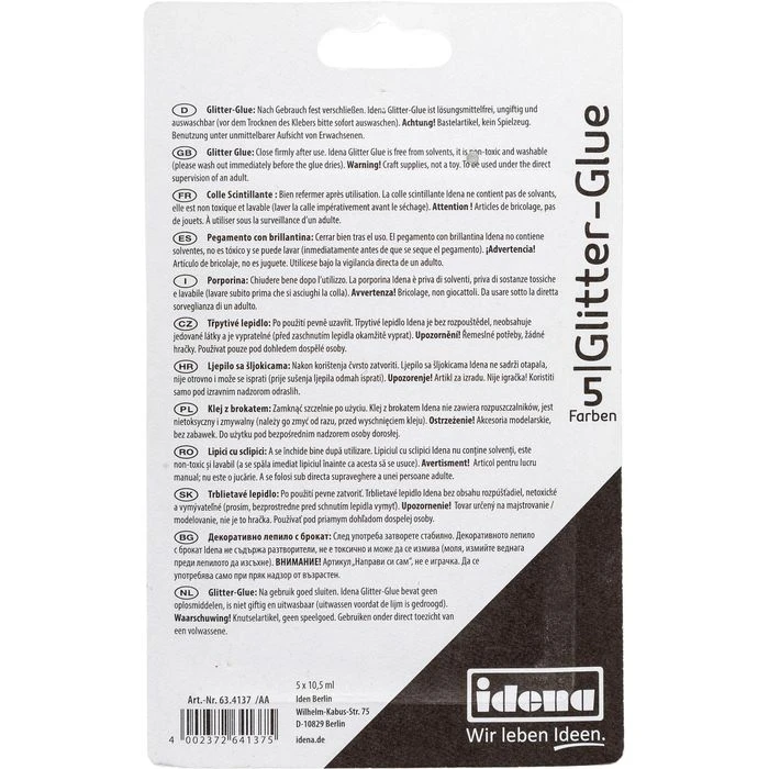 Hinweis: Glitzerkleber vorsichtig verwenden. Vor Gebrauch stets Etikett und Produktinformationen lesen.