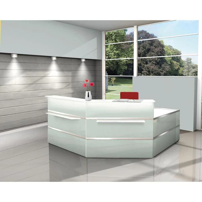 sonstiges: Theke bestehend aus 2 Thekenelementen, einem Anbautisch, zwei Taschenablagen und zwei Seitenblenden, Arbeitsplatte 75 cm hoch mit drei 60 mm Kabeldurchlassdosen, melaminharzbeschichtete E1-Qualitäts-Spanplatte, 2 mm starke ABS-Kanten, Arbeitsplatte, Ablageplatte und Seitenblenden 19 mm stark, Front mit zwei 20 mm hohen Edelstahlstreifen, Front- und Seitenblenden mit 4 mm starkem Einscheibensicherheitsglas, rückseitig weiß lackiert, Metallteile pulverbeschichtet