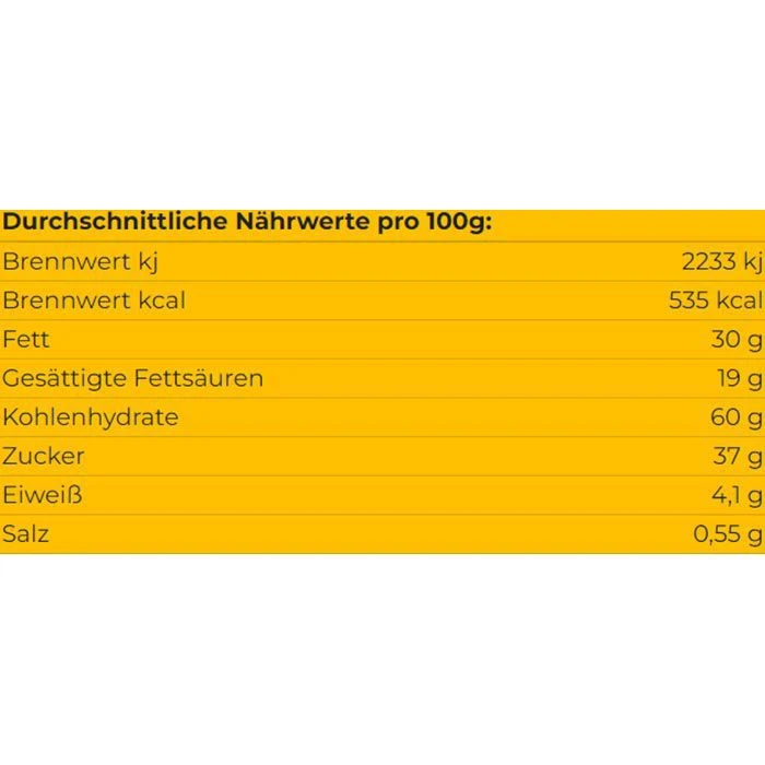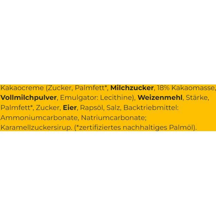 Zutaten: Kakaocreme (Zucker, Palmfett*, MILCHZUCKER, 18% Kakaomasse, VOLLMILCHPULVER, Emulgator: Lecithine), Weizenmehl, Stärke, Palmfett*, Zucker, Eier, Rapsöl, Salz, Backtriebmittel: Ammoniumcarbonate, Natriumcarbonate; Karamellzuckersirup. (*zertifiziertes nachhaltiges Palmöl).