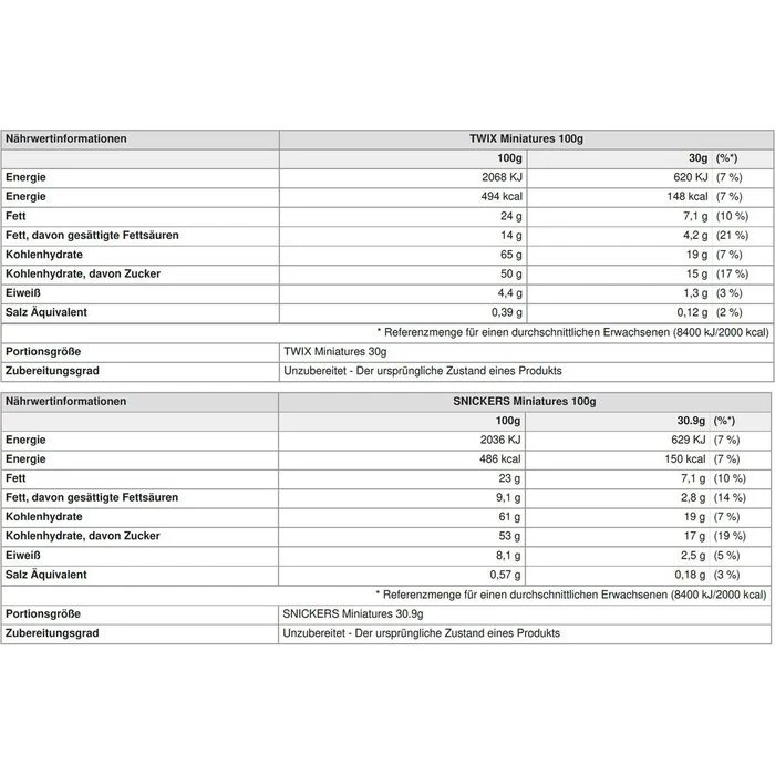 Twix – Zucker, Glukosesirup, WEIZENMEHL, Palmfett, Kakaobutter, MAGERMILCHPULVER, Kakaomasse, MILCHZUCKER, Butterreinfett (aus MILCH), Süßmolkenpulver (aus MILCH), fettarmer Kakao, Emulgator (SOJALECITHIN), Salz, Backtriebmittel (E500), natürlicher Vanilleextrakt