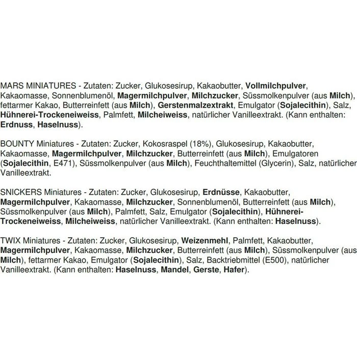 Snickers – Zucker, Glukosesirup, ERDNUSS, Kakaobutter, MAGERMILCHPULVER, Kakaomasse, MILCHZUCKER, Sonnenblumenöl, Butterreinfett (aus MILCH), Süssmolkenpulver (aus MILCH), Palmfett, Salz, Emulgator (SOJALECITHIN), HÜHNER-TROCKENEIWEISS, MILCHEIWEISS, natürlicher Vanilleextrakt.