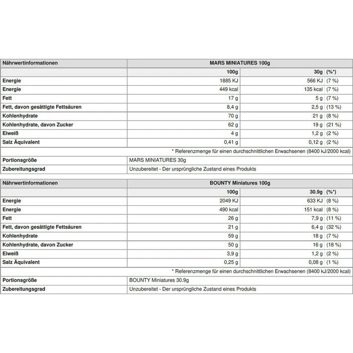Bounty – Zucker, Kokosraspel (18%), Glukosesirup, Kakaobutter, Kakaomasse, MAGERMILCHPULVER, MILCHZUCKER, Butterreinfett (aus MILCH), Emulgatoren (SOJALECITHIN, E471), Süßmolkenpulver (aus MICLH), Feuchthaltemittel (Glycerin), Salz, natürlicher Vanilleextrakt