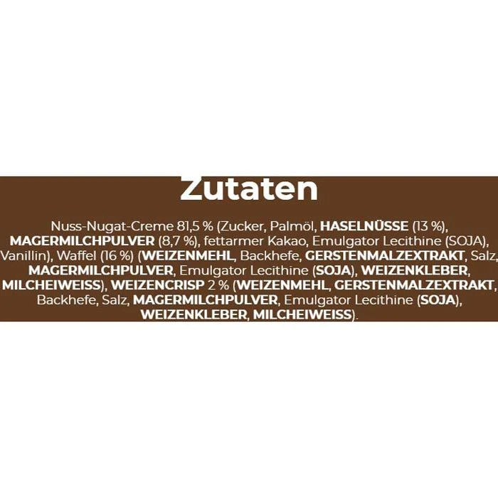 Nuss-Nugat-Creme 81,5% (Zucker, Palmöl, HASELNÜSSE (13%), fettarmer Kakao, MAGERMILCHPULVER (6,6%), SÜSSMOLKENPULVER, Emulgator Lecithine (SOJA), Vanillin), Waffel 16% (WEIZENMEHL, Backhefe, GERSTENMALZEXTRAKTPULVER, Salz, MAGERMILCHPULVER, Emulgator Lecithine (SOJA), WEIZENKLEBER, MILCHEIWEISS), WEIZENCRISP 2% (WEIZENMEHL, Backhefe, GERSTENMALZEXTRAKTPULVER, Salz, MAGERMILCHPULVER, Emulgator Lecithine (SOJA), WEIZENKLEBER, MILCHEIWEISS)