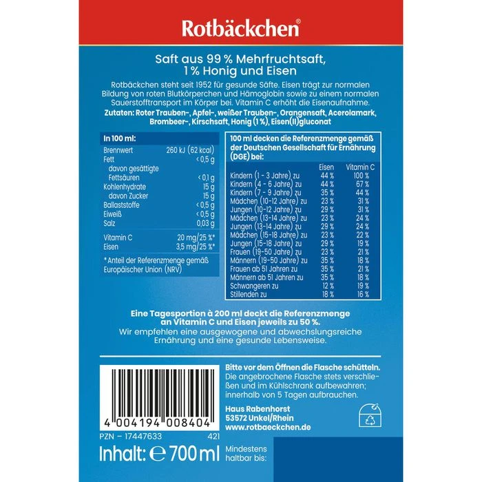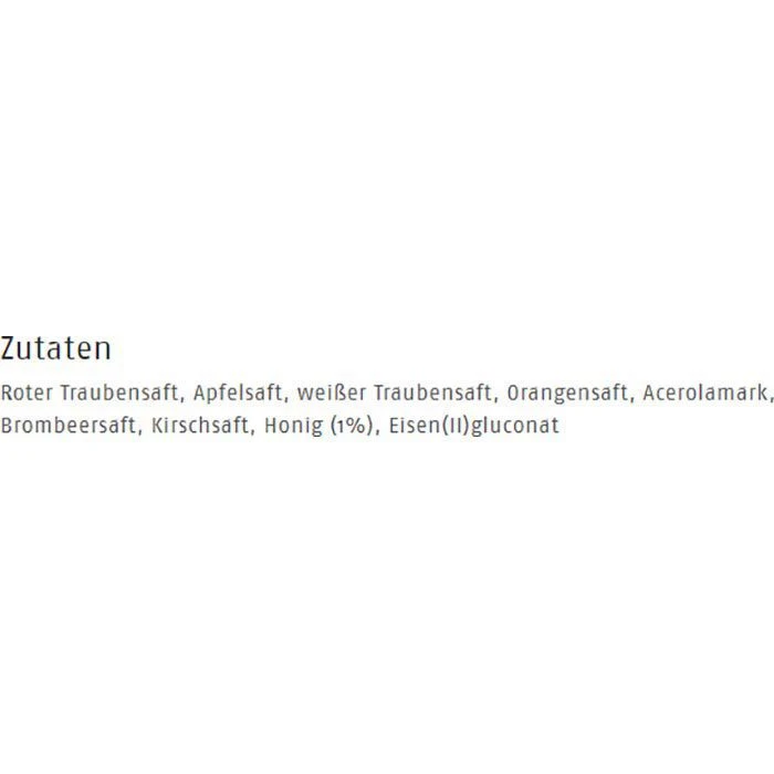 Zutaten: Roter Traubensaft, Apfelsaft, weißer Traubensaft, Orangensaft, Acerolamark, Brombeersaft, Kirschsaft, Honig (1%), Eisen(II)gluconat.