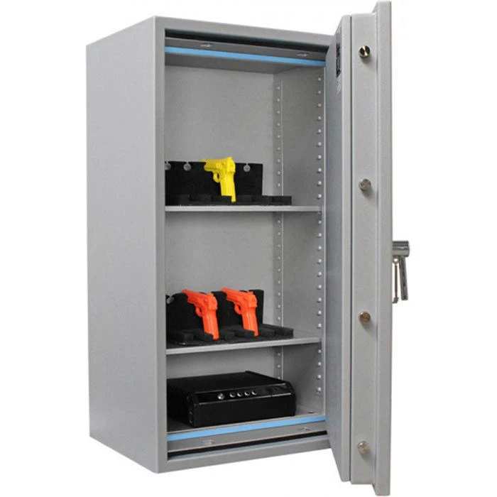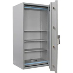 sonstiges: Feuerschutz-Zertifizierung für Dokumente gemäß EN 1047-1 S60P, Versicherungsschutz möglich bis: 20.000 € (gewerblich) / 65.000 € (privat), aufbohrgeschütztes Schloss, vierseitige Verriegelung mit 12 Bolzen, Türöffnungswinkel 180° durch außenliegende Scharniere, Türstärke 110 mm, Drehgriff, Fachböden verstellbar, eine Bohrung im Boden (16 mm) zur sicheren Verankerung, glanzverchromter Beschlag, entspricht §36 des Deutschen Waffengesetzes, geeignet für die feuersichere Aufbewahrung von Dokumenten aus Papier und Wertgegenständen