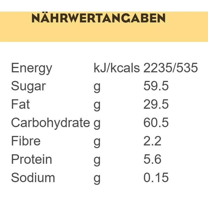 Zutaten: Zucker, VOLLMILCHPULVER, Kakaobutter, Kakaomasse, Honig (3%), BUTTERREINFETT, MANDELN (1,6%), Emulgator (SOJALECITHIN), EIKLAR, Aroma