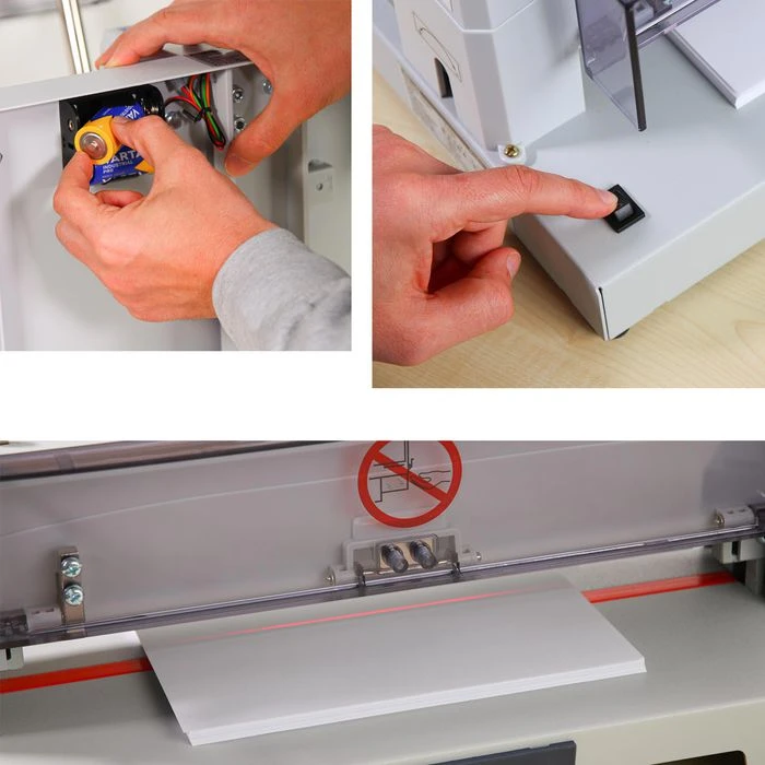 sonstiges: Obermesser, Schutzhaube aus Blech, Ganzmetall-Konstruktion, verstellbarer Rückanschlag mit cm-, DIN- und Zoll-Teilung