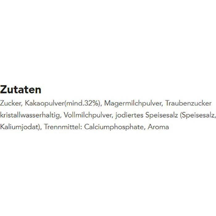 Zucker, Kakaopulver(mind.32%), Magermilchpulver, Traubenzucker kristallwasserhaltig, Vollmilchpulver, jodiertes Speisesalz (Speisesalz, Kaliumjodat), Trennmittel: Calciumphosphate, Aroma