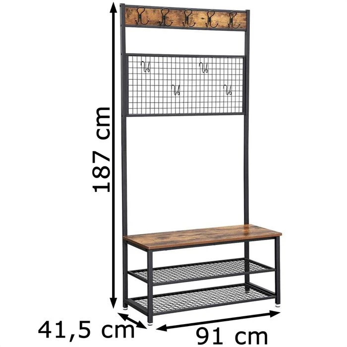 sonstiges: 5 Doppel-Haken und 4 Haken am mittleren Metallgitter, standsicheres Metallgestell mit 2 Gitter-Ablagen und MDF-Platten nach Emissionsklasse E1, ausgestattet mit Nivellierfüßen und Kippschutz