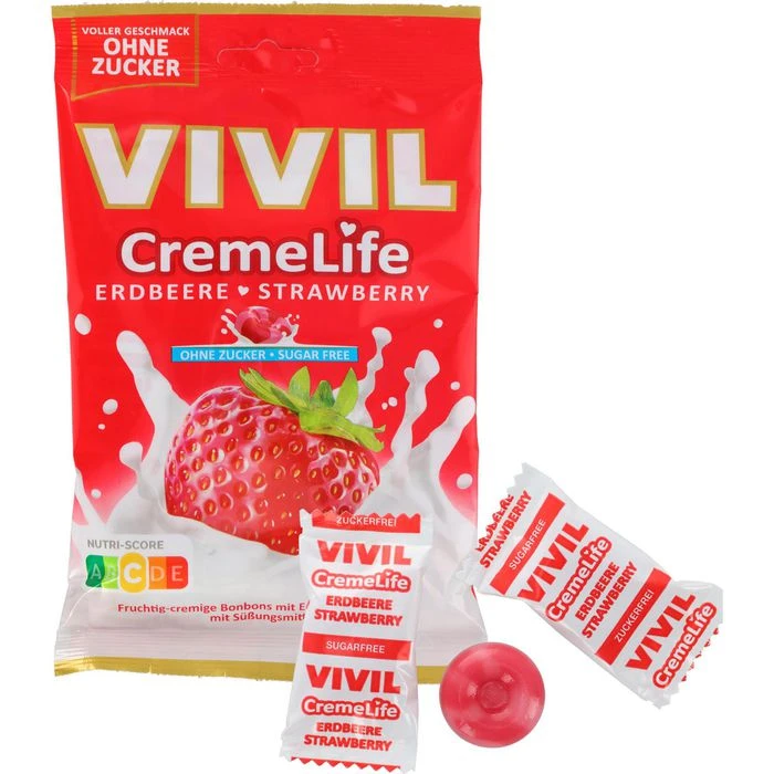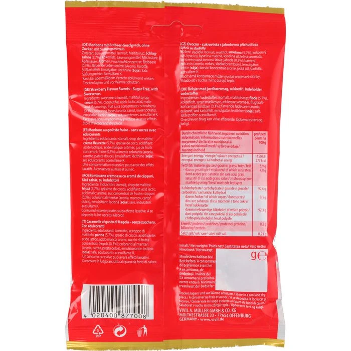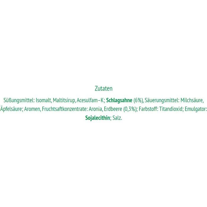 Zutaten: Süßungsmittel: Isomalt, Maltitsirup, Acesulfam–K; SCHLAGSAHNE (6%), Säuerungsmittel: Milchsäure, Äpfelsäure; Aromen, Fruchtsaftkonzentrate: Aronia, Erdbeere (0,3%); Farbstoff: Titandioxid; Emulgator: SOJALECITHIN; Salz.